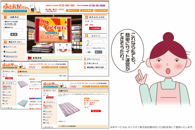 実店舗を増やすとなると、資金や経営リスク等とかく悩みはつきもの。ショッピングサイトの運営ならそんな悩みも解決できます。サイト制作から維持まですべて当社がフルサポートできます。お客様は商品の画像や情報をアップロードするだけの簡単管理です。